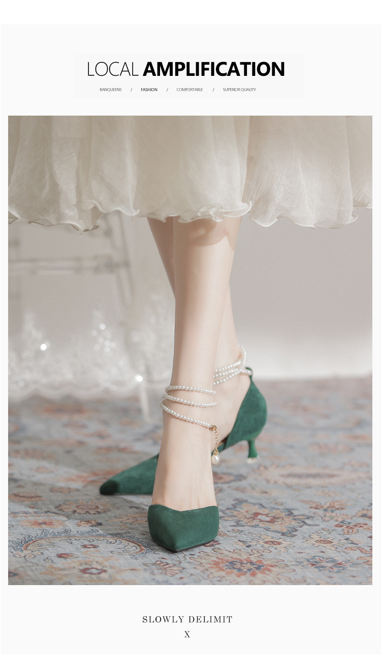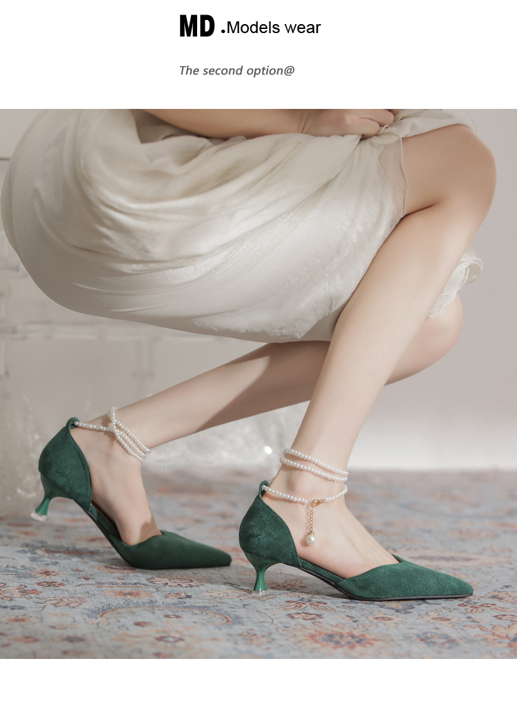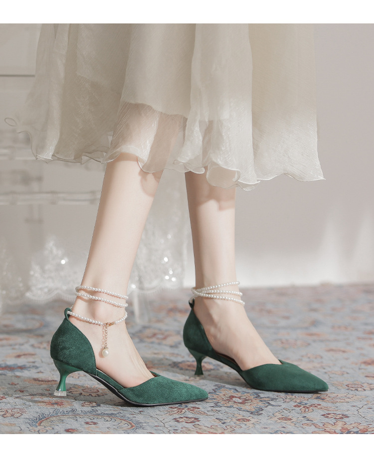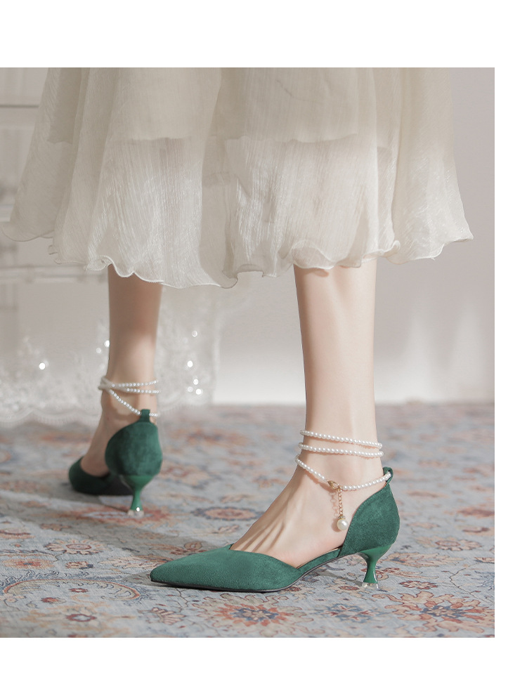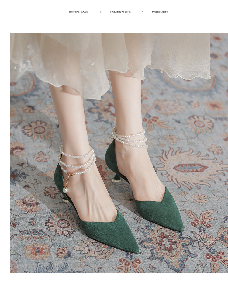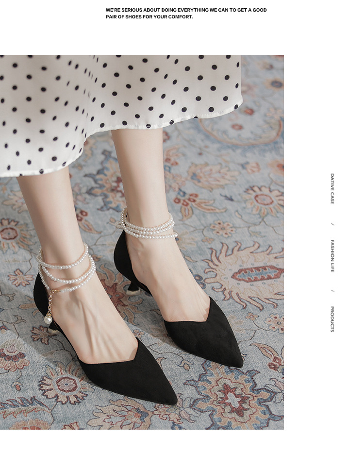 Fashionable High Heel Shoes with French Vintage Low Heel and Pearl Chain Buckle